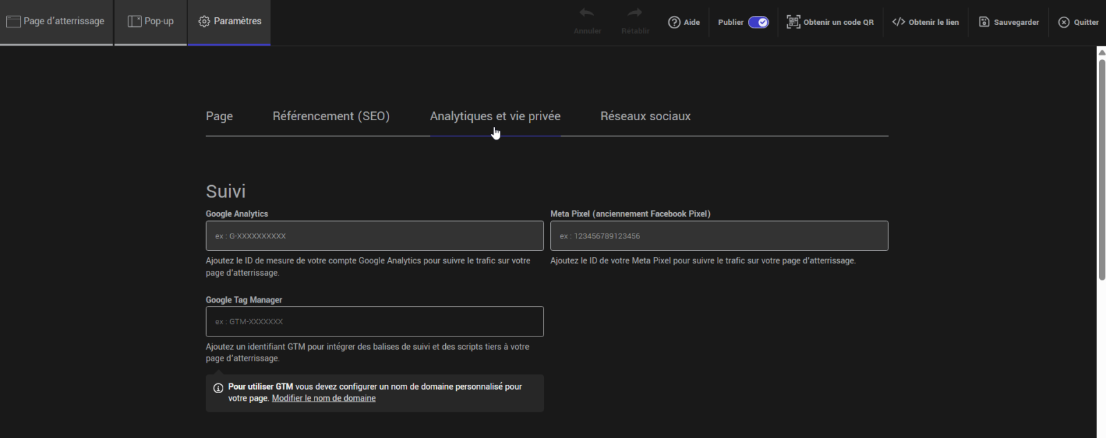 Dans GTM, récupérez le code du conteneur (ex. GTM-XXXX) et ajoutez-le dans le champ Google Tag Manager des paramètres de votre page d’atterrissage.
