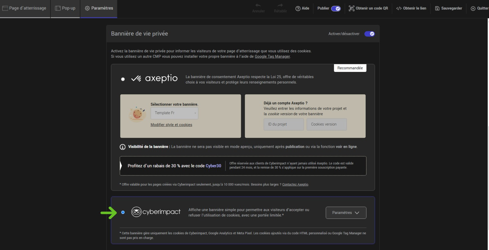 La bannière Cyberimpact est intégrée directement dans la plateforme, ce qui signifie qu’il n’est pas nécessaire d’utiliser un outil tiers pour afficher un message de consentement sur vos pages d’atterrissage. Son activation est simple et rapide : en quelques clics, la bannière peut être affichée pour informer vos visiteurs et recueillir leur consentement concernant les cookies utilisés par Cyberimpact, notamment pour les formulaires et les statistiques de la page.