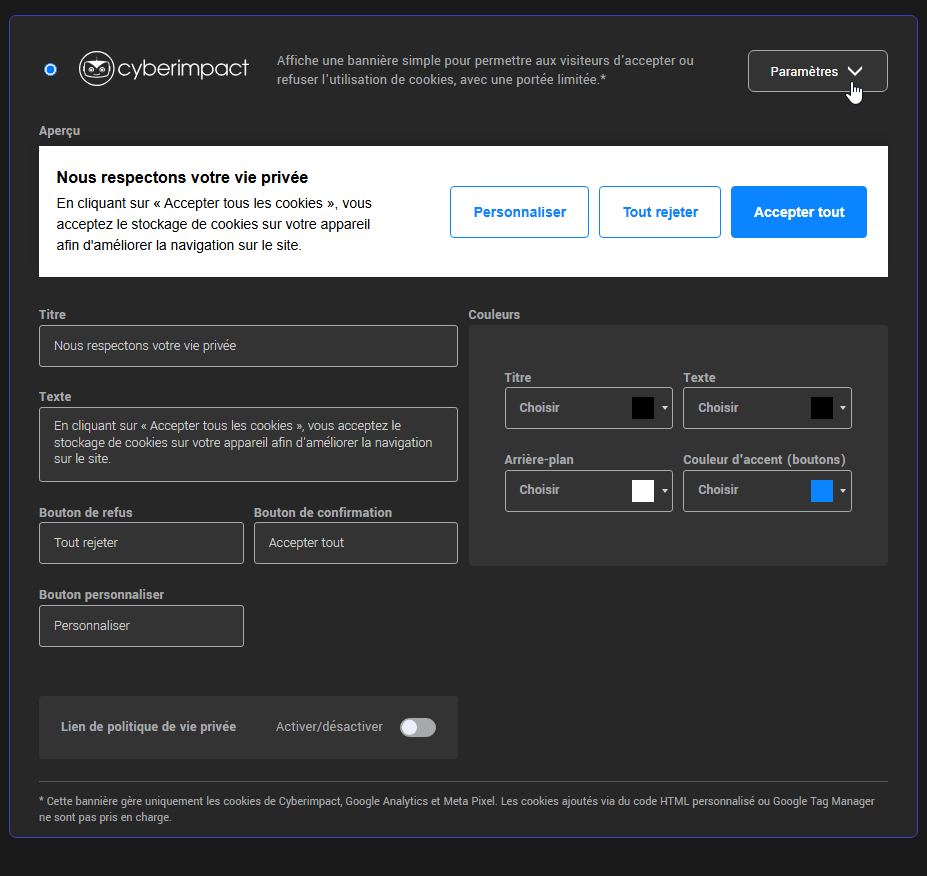 Vous pouvez aussi ajouter un lien vers votre politique de vie privée en activant l’interrupteur dédié et en renseignant l’URL ainsi que le nom du lien, qui s’affiche par défaut comme « Consultez notre politique sur la vie privée ».